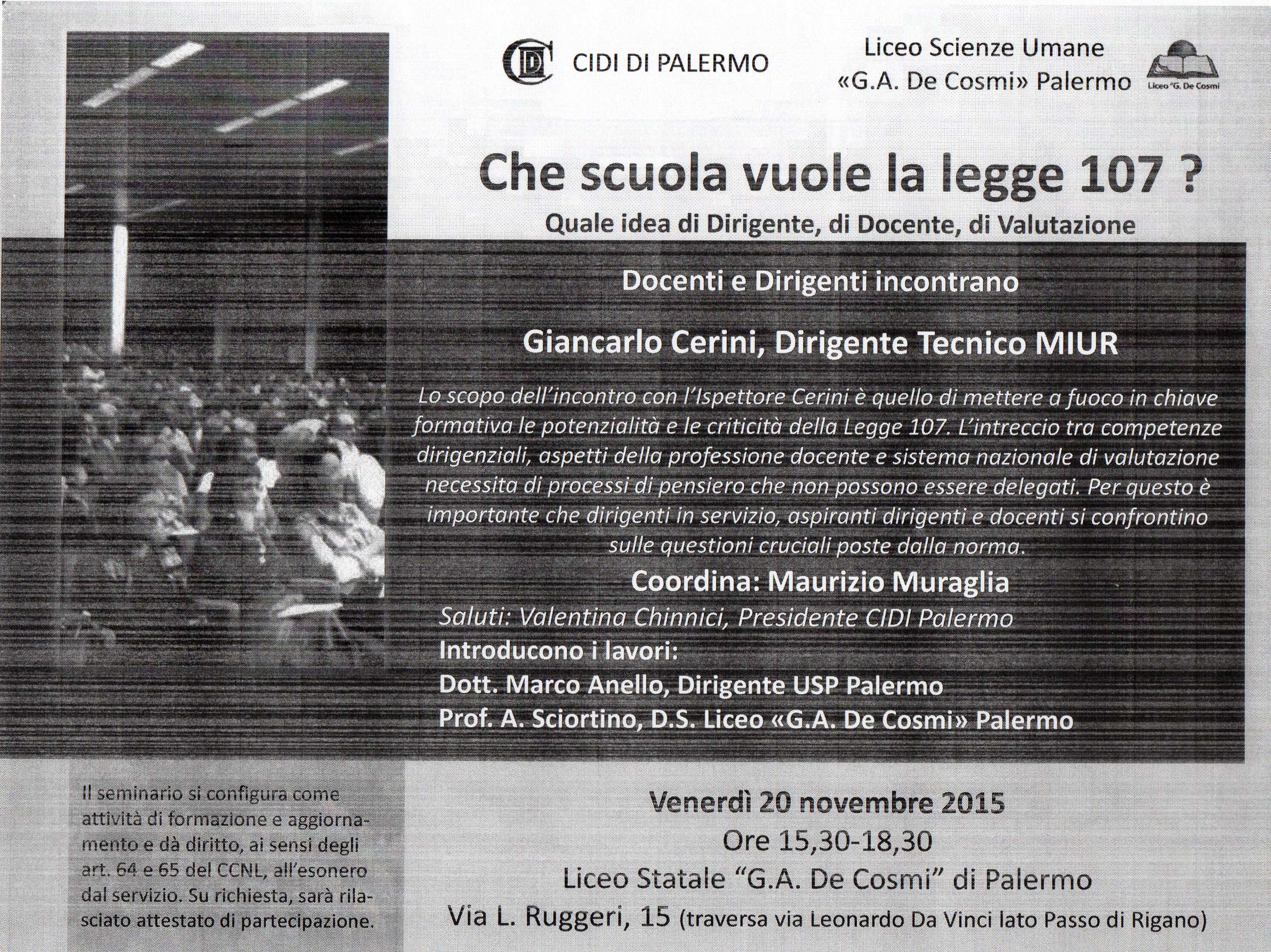 Venerdì 20 novembre al Liceo “De Cosmi” di Palermo Giancarlo Cerini ha sfidato dubbi, perplessità, criticità, arrabbiature varie intrufolandosi nei meandri della Legge 107 con la sua conseueta onestà intellettuale e ascoltando attentamente gli interventi di tutti, docenti e dirigenti. Ne è venuto fuori un pomeriggio intenso, i cui contenuti è possibile recuperare qui: