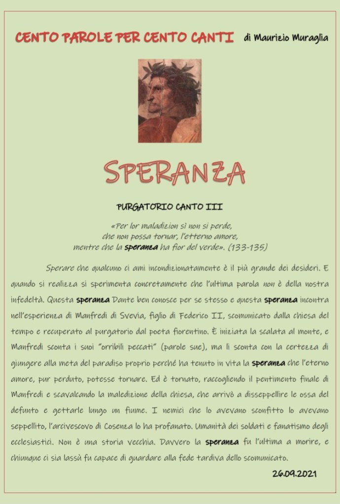 Era domenica 17 gennaio quando iniziò il nostro viaggio nell’Inferno di Dante attraverso le parole. Il senso dell’operazione, spiegato a suo tempo, si può recuperare qui. La prima parola, significativamente, era “paura”. Eravamo chiusi in casa e la paura, come oggi, non mancava. Adesso, con la parola dell’ultimo canto infernale pubblicata domenica (“pianto”, ancora attuale…), siamo arrivati al fondo dell’imbuto e usciamo a “riveder le stelle”. Da domenica 12 settembre, senza interruzioni, il cammino ripartirà col primo canto del Purgatorio. Saliremo sul monte fino al paradiso terrestre che raggiungeremo domenica 24 aprile del 2022, con l’auspicio che si tratti anche di un paradiso post pandemia.