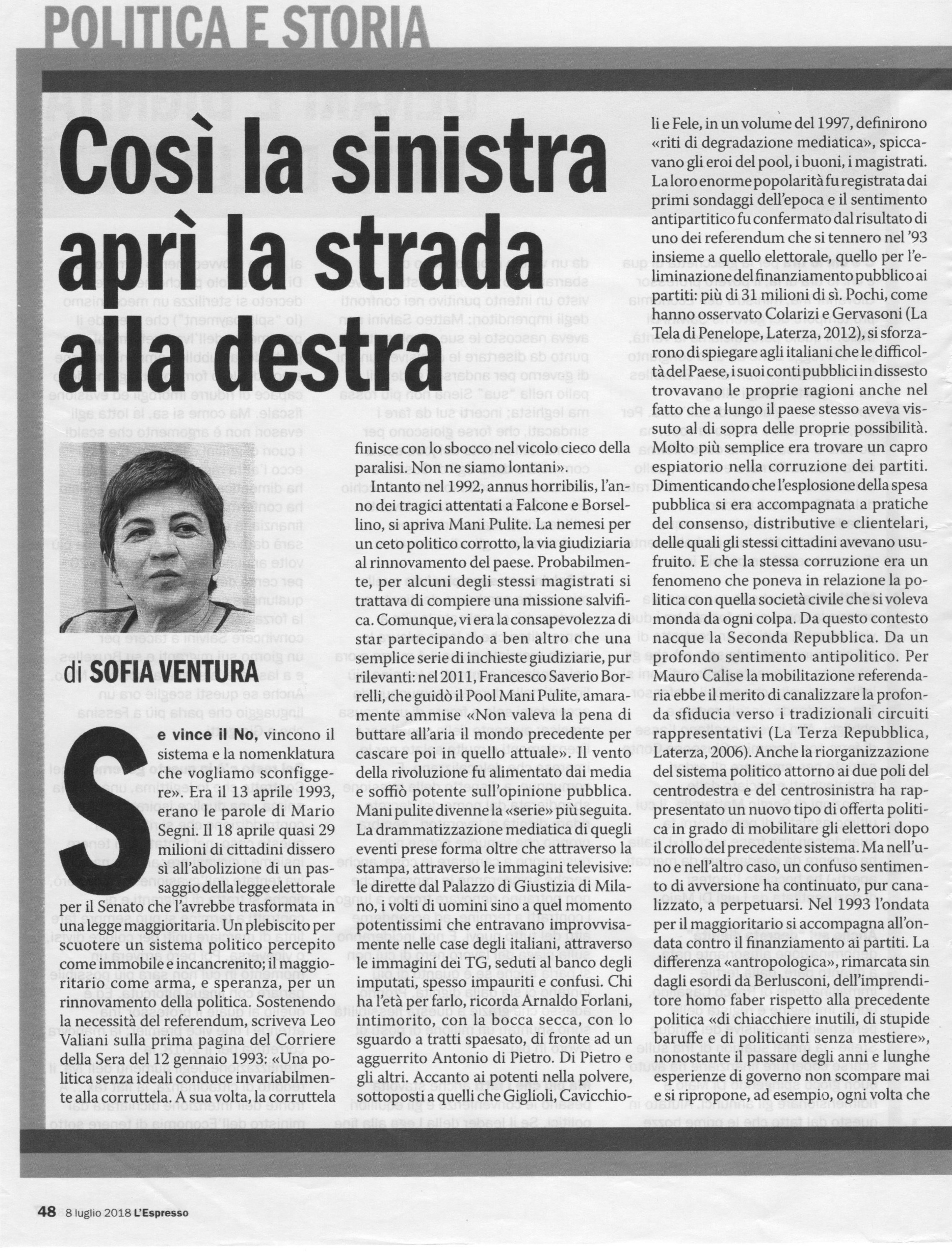 Questo articolo della politologa Sofia Ventura ricostruisce le vicende della politica italiana dell’ultimo quarto di secolo. Lo fa utilizzando alcune parole quali “populismo”, “antipolitica”, “rottamazione”, “corruzione” che costituiscono l’ossatura di un discorso sulla contemporaneità politica. I documenti sulla scuola risuonano pomposamente di altre parole quali “cittadinanza”, “Costituzione”, “partecipazione”, “identità”. Leggendo questo articolo moltissimi insegnanti, da me stimolati, mi hanno confidato il loro scetticismo non tanto sulla possibilità che la nostra storia più recente possa essere oggetto di discussione in classe, quanto sulla possibilità che la stessa storia sia addirittura conosciuta dai docenti delle nostre scuole.
