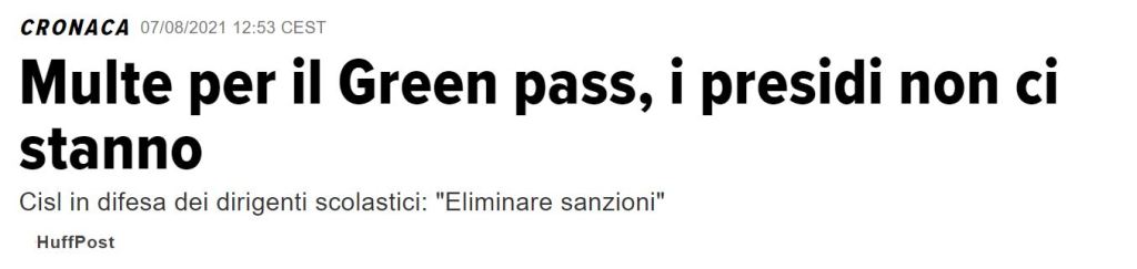 Ho molto rispetto per il difficile lavoro dei dirigenti scolastici, e davvero mi onoro dell’amicizia di tanti di loro. Però a quel che leggo in questi giorni c’è qualcosa che sul piano logico mi sfugge. Credo non occorra una laurea in Legge per capire che non può esistere norma senza che la sua trasgressione venga sanzionata. Lo ha ben ricordato Giannelli dell’ANP (a proposito: è un ottimo dirigente, ma quando i media lo definiscono “il capo dei presidi” occorre ricordare che il capo dei presidi è la Repubblica italiana). Eppure si discute animatamente nel mondo della scuola sulle multe che i dirigenti scolastici subirebbero nel caso in cui venisse trasgredita la norma relativa all’obbligo di green pass per il personale scolastico. Leggo di proteste vibranti. Leggo dei soliti carichi sulle spalle dei presidi, leggo di qualcuno che riterrebbe incongruo sanzionare i docenti privi di green pass perché la scuola è “una istituzione culturale” (Lo Scrudato).