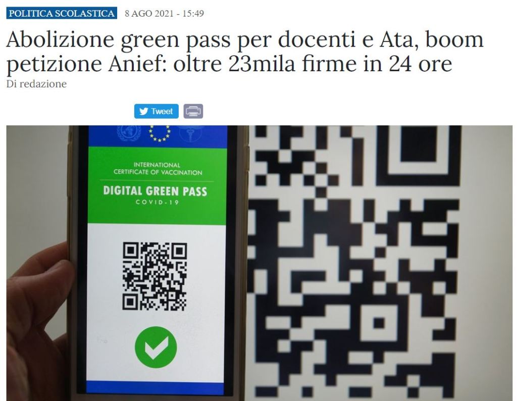 - Ci fanno assistere ORA alle petizioni o alle contorsioni dialettiche dei sindacati scolastici che non vogliono il greenpass però lo vogliono se anche gli altri, ma se invece gli altri allora noi, ma invece noi e perché no gli altri perché la comunità educante il lavoratore la discriminazione blabla. Mentre la gente muore. Congratulazioni.